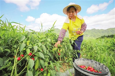 图为村民在该镇解放村辣椒种植基地采摘辣椒。