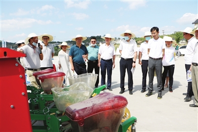 图为参会人员正在观摩施肥新机具。 (李凤涛 摄)