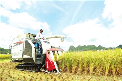 8月23日,农民在贵州省都匀市平浪镇凯口村收割水稻。