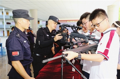 活动中,民警向同学们介绍和普及警用枪械、防爆盾牌等装备的性能、用法和相关知识。