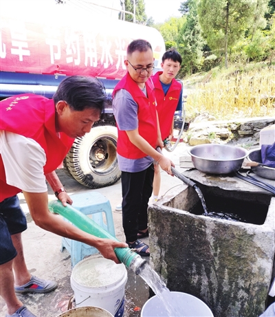 连日来,持续高温天气导致桐梓县小水乡的部分群众出现不同程度用水短缺现象。该乡党委、政府采取多种举措,努力保障群众的生活用水。截至目前,共投入资金10.8万元,购买水管14100米、抽水泵3台,组织送水近40次,覆盖群众1334人。图为该镇干部为群众送水。