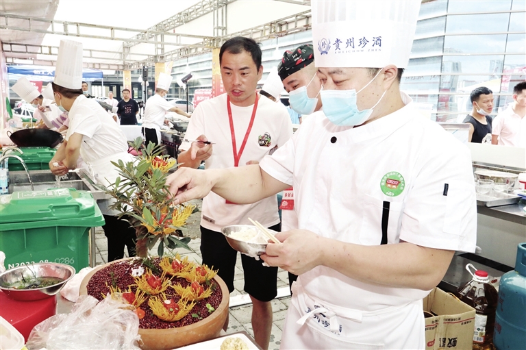 本次比赛由遵义市餐饮美食服务行业商会主办,全市52家餐饮企业参加。通过规定菜式、自创菜式等项目的比拼,最终评出4个特金奖、6个金奖、10个银奖。图为选手在比赛中。