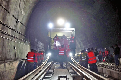 10月28日凌晨,在四川省凉山彝族自治州喜德县小相岭隧道内,施工人员进行成昆铁路复线铺轨工作。
