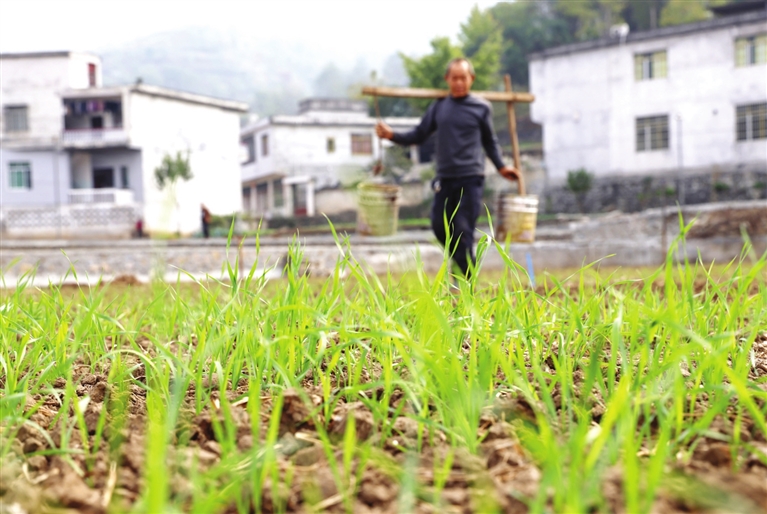 11月7日,贵州省遵义市正安县安场镇胜利社区农民在田间管护麦苗。