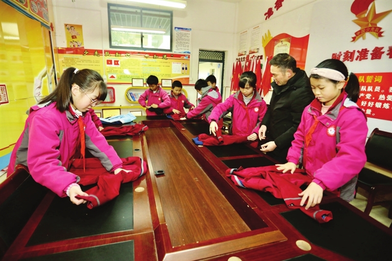 为增强学生劳动意识和综合实践能力,遵义市银河小学在校内劳动教育实践基地——“启智苑”开展多学科融合实践观摩活动,引导学生学习衣物整理、卫生清洁等技能。
