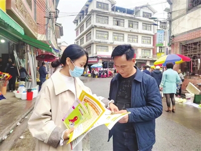 近日,仁怀市苍龙街道组织相关人员在水塘村开展科普知识进乡村宣传活动,向村民普及科学防疫、疾病预防等知识。图为工作人员在发放资料。