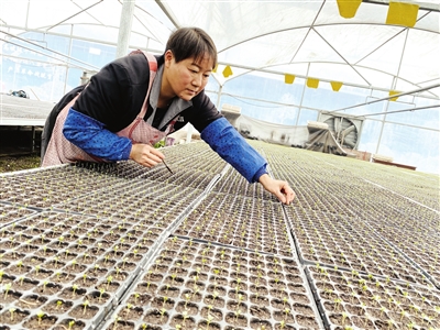 近年来,道真自治县河口镇坚持党建引领,整合相关配套资金建设了温室育苗基地,每年可培育辣椒、白菜、花菜等蔬菜苗400万株。图为村民正在培育花菜种苗。