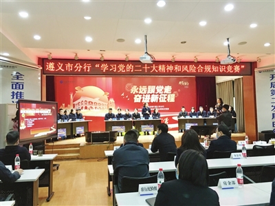 为进一步激发全行员工的学习热情,营造浓厚的学习宣传贯彻党的二十大精神氛围,近日,建行遵义市分行开展学习党的二十大精神和风险合规知识竞赛。通过本次竞赛,充分调动了该行员工的学习积极性、主动性。图为竞赛现场。