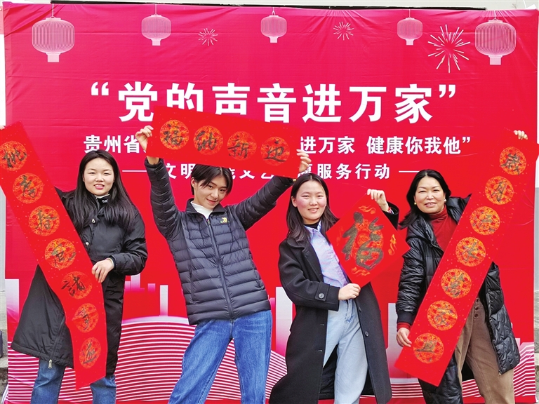 1月10日,“党的声音进万家”——贵州省文联2023年“文艺进万家 健康你我他”文明实践文艺志愿服务行动走进绥阳县。图为来自省摄影家协会、省电影家协会、省民间文艺家协会、省书法家协会和市文联、绥阳县文联的志愿者为群众写春联、送福字。