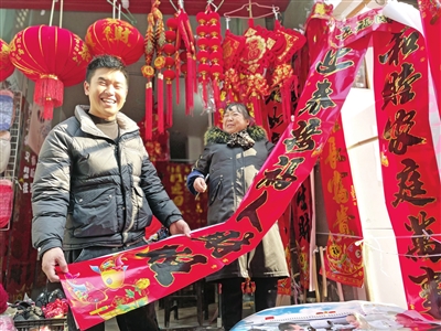 1月10日,在桐梓县狮溪镇,春联、福字、大红灯笼、干果等琳琅满目的年货摆满集市,群众忙着置办年货,喜迎春节。图为群众选购春联。