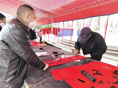 1月16日,绥阳县2023年“写春联送万福”文明实践活动在诗乡广场举行,活动邀请绥阳县书法家协会的志愿者为群众免费书写春联。图为活动现场。