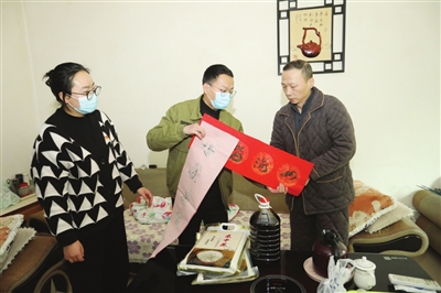 图为1月15日,老城街道官井社区工作人员为困难群众送去粮油、春联等慰问品。