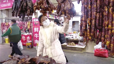 连日来,赤水市城区大街小巷人头攒动、热闹非凡,商品琳琅满目,处处洋溢着喜迎新春的氛围。图为市民在选购香肠和腊肉。