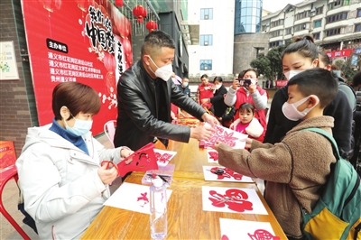 近日,红花岗区老城街道开展“我们的中国梦·文化进万家”——非遗迎新春活动,组织府后山社区“非遗工坊”的非遗传承人和剪纸、编织爱好者,为居民现场制作并赠送饱含新春祝福的窗花和中国结。图为居民领取窗花。 (记者 向婧 吴凡 摄影报道)
