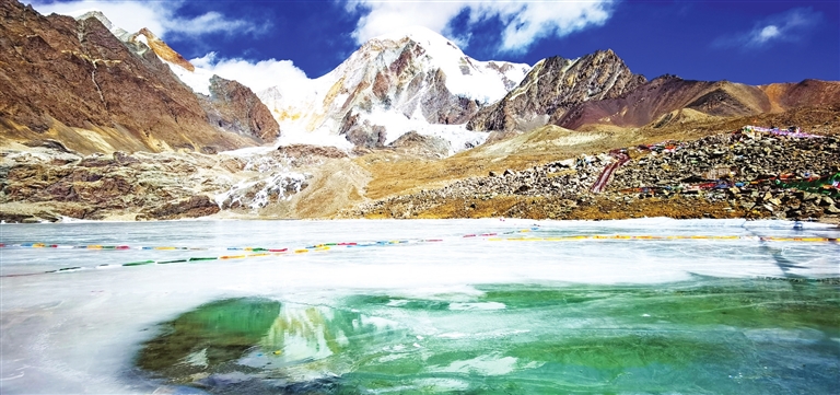 西藏拉萨市尼木县境内的琼穆岗嘎峰海拔7048米,是念青唐古拉山脉南端最后一座高峰。琼穆岗嘎冰川气势恢宏,冰臼湖群点缀其间,湖水结冰后呈现出梦幻般的色彩,恍若仙境。