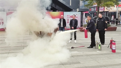 为切实做好春季火灾防控工作,近日,新蒲新区新蒲街道在林达商圈开展消防安全知识讲座和应急演练活动。图为参训人员学习使用灭火器。