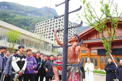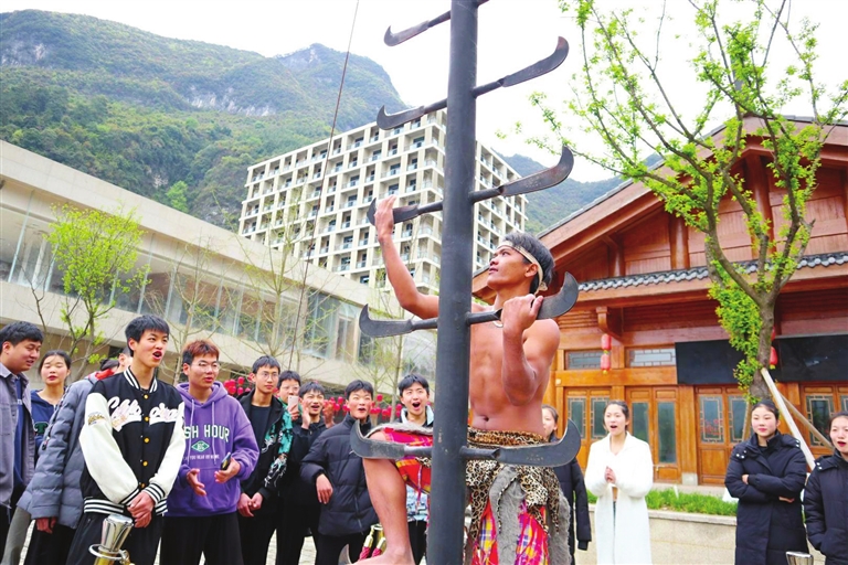 在道真自治县中国傩城,非遗绝活“上刀梯”表演吸引了不少游客观看。