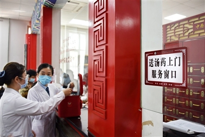 5月10日,青岛西海岸新区中医医院护士在中药房替患者领取药品。