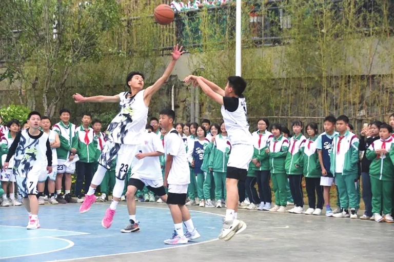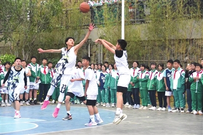 日前,遵义四中实验初中(新蒲中学)首届“骆驼杯”校园篮球班级联赛开赛,比赛时间为期半个月,将持续到5月下旬。图为比赛现场。