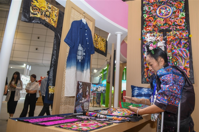 6月27日,在第四届全国残疾人展能节上,来自贵州的张艳梅展示自己制作的苗绣产品。