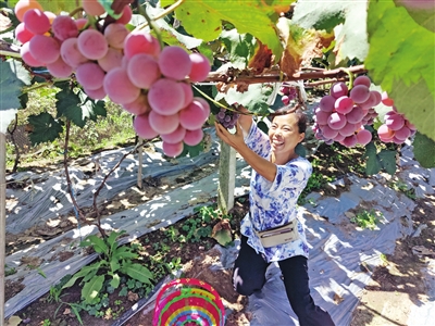 图为7月5日,在长兴村原生态葡萄园,村民在采摘葡萄。