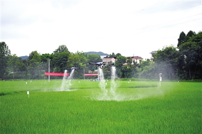 图为7月4日,无人机在余庆县松烟镇觉林村的稻田里开展灭虫作业。