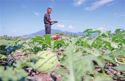 连日来,正安县安场镇官井社区群众抢抓农时,做好西瓜夏季管理工作。 赵永章 摄 (遵义图库发)