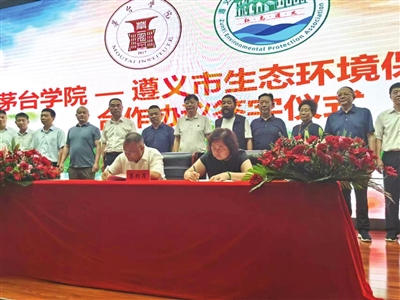 7月7日,遵义市生态环境保护协会与茅台学院签订为期三年的合作框架协议,目的在于通过该协会与茅台学院共同携手,搭建起人才培养和人才引进平台,为当地企业发展提供人才引进渠道,同时也为茅台学院学生提供更多就业机会。 (记者 樊明富 摄)