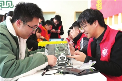 3月3日,在西南大学学生园区志愿服务活动现场,大学生志愿者在给同学维修笔记本电脑。