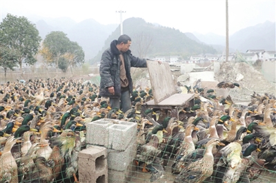 聚禾生态农业发展有限公司负责人张军,前些年在绥阳县风华镇金承社区流转土地1000余亩,用于发展种植养殖业。目前,养殖7000余只鸭,实现循环生态养殖。图为工人在喂养鸭子。