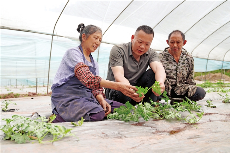 图为赤水市果蔬种植技术员在复兴镇复兴村果蔬园区内讲解西瓜苗病虫害预防技术。