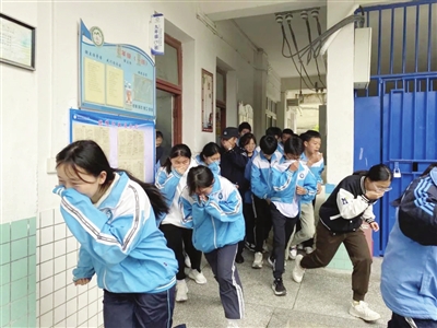 近日,绥阳县公安局郑场派出所联合郑场中学开展了消防疏散逃生演练,进一步增强师生消防安全意识,营造安全、稳定、和谐的校园环境。图为演练现场。 (记者 胡雪 摄)