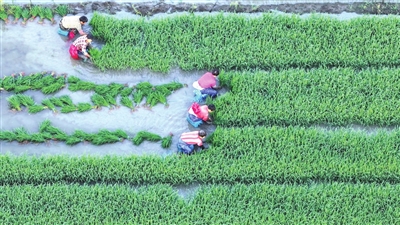 当下是晚稻插秧的季节,农民抢抓农时进行晚稻插秧。