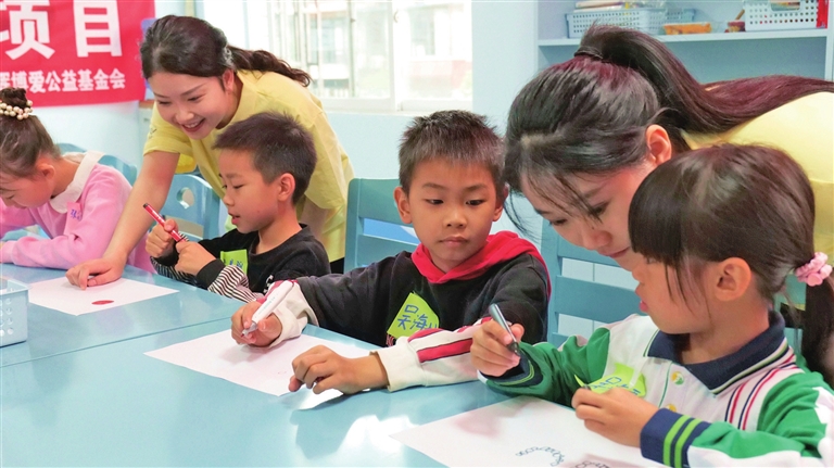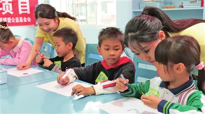 图为10月26日,北京春晖博爱公益基金会工作人员带领社区未成年人一起画画。