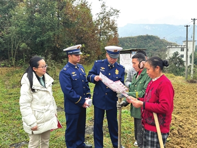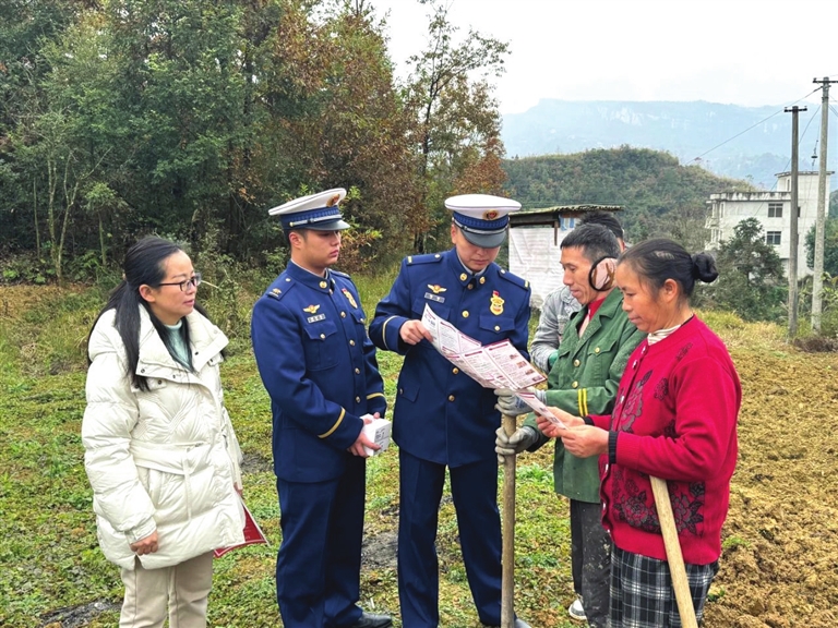 连日来,正安县消防救援大队组织工作人员深入村(社区)开展消防安全宣传,并对消防隐患进行排查。图为该大队工作人员在向村民讲解农村冬季用火用电安全注意事项。