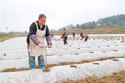 图为3月16日,进化镇临江村一烤烟种植大户组织人员在烟地打坑施底肥。