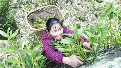 近年来,赤水市葫市镇立足林地资源优势,采取“党支部+合作社+农户”的组织方式,带领群众在林下石头上栽种金钗石斛,通过售卖鲜条和花卉,鼓起了群众“钱袋子”。图为3月26日,该镇村民正在采收石斛鲜条。