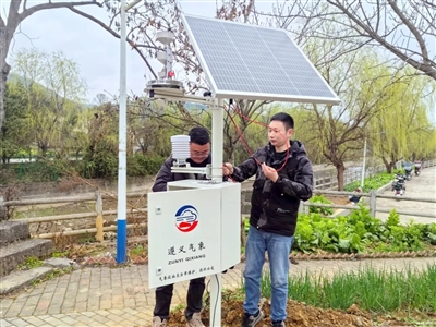 近日,在红花岗区海龙镇龙泉村大桥旁,红花岗区气象局工作人员与安装工人迅速完成一座微型智能气象监测站的安装。