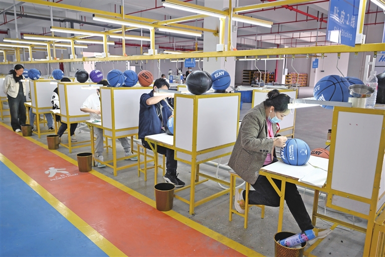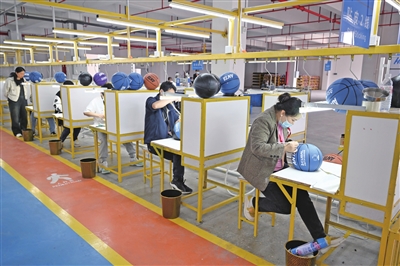 位于余庆经开区的贵州球韵体育用品制造有限公司是一家从事体育用球生产与销售的企业,产品远销欧美和东南亚。连日来该公司生产繁忙,工人加足马力赶制订单产品。图为工人正在生产篮球。