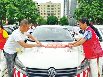 图为志愿者为服务车辆贴上“爱心免费送考车”标识。