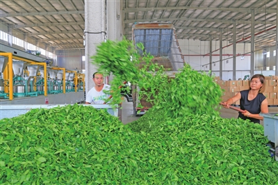 近日,贵州黔茶农业有限公司生产车间工人在摊凉茶叶。