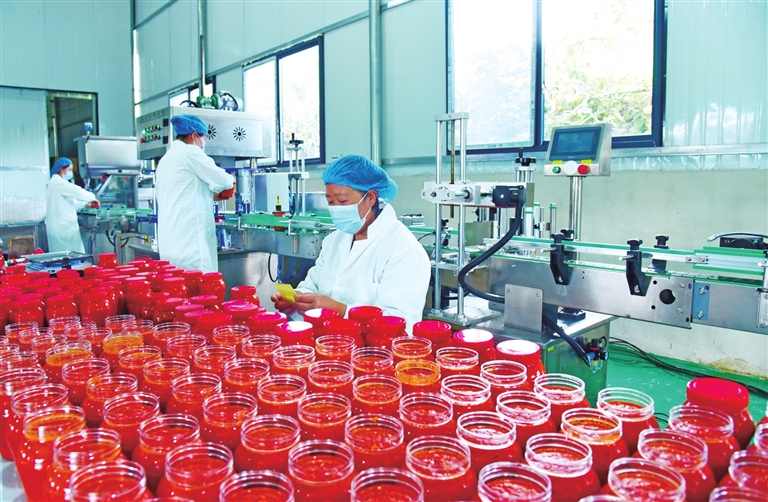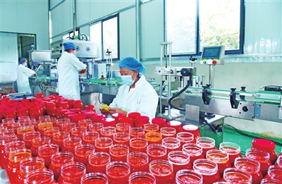 图为9月27日工人在位于凤冈县琊川镇茅台村的中塬农业发展(遵义)有限公司生产车间瓶装辣椒制品。