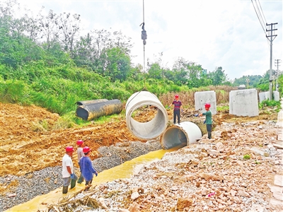 图为近日,工人在龙潭湖湿地公园路段进行排洪管道“微改造”作业。