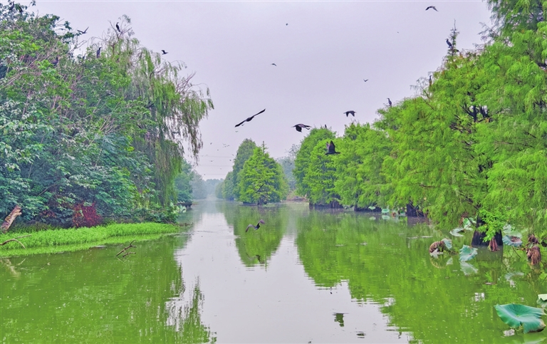 清晨,百鸟争鸣,婉转悦耳;黄昏,夕阳西下,群鸟归巢。乘船穿行朱湖湿地公园湖面,只见一群群鸬鹚或展翅高飞,或栖息树间,或觅食嬉戏,不禁感慨:好一个鸟类天堂!
