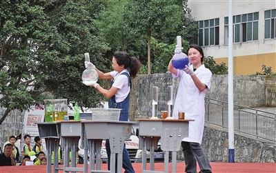 图为科普老师在为同学们做化学实验。
